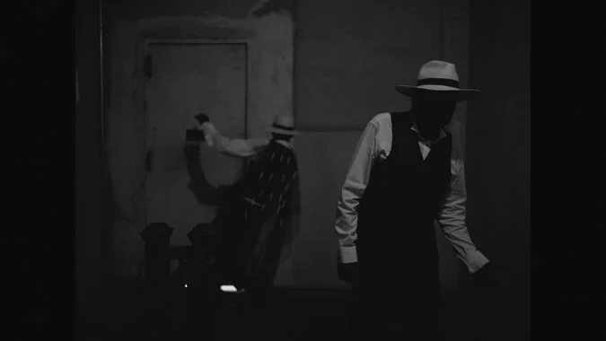 The literal shadows, or “dark corners,” in Fly Paper, instead, belong to Joseph’s intense engagement with DeCarava’s photography, and his desire to pay homage to the photographer’s same ground: some of the shots repeat original photographs almost verbatim –a row of tenement houses, dimly lit hallways, human figures as silhouettes in empty Harlem lofts bathed in light coming from oversized windows. When Vereen and Storyboard P engage in an extraordinarily melancholic dance duet mid-way through the film, both of their faces remain in the shadow, in keeping with DeCarava’s style; that is also the case later, when the montage of a percussions-heavy jam session in an empty Harlem loft combines extreme close-ups of the musician’s hands emerging from a deep darkness, feet, and accelerated footage that chases their elongated shadows projected onto a far-away wall: their faces remain obscured the entire time, while the details of their hands, close-ups of their tapping feet, or of the chords of their instruments directly references a plethora of DeCarava’s images.